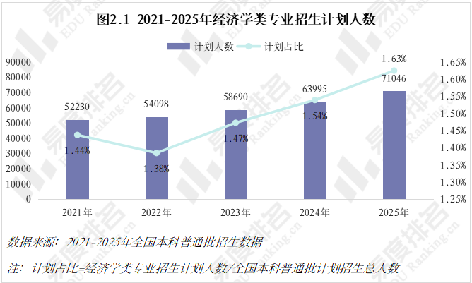 2025年经济学类专业计划招生7.1万人,较上年增长7000余人,增幅为11%。近年该专业类计划招生人数在全国普通本科批的占比稳步提升,到2025年占比达到1.63%。