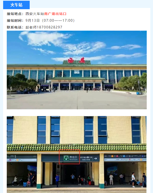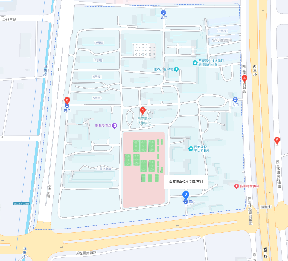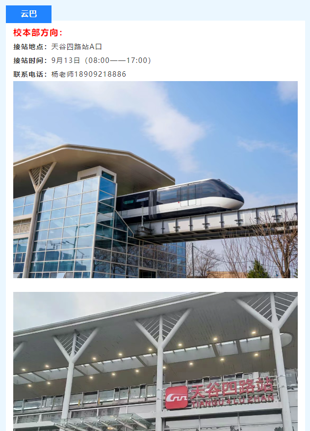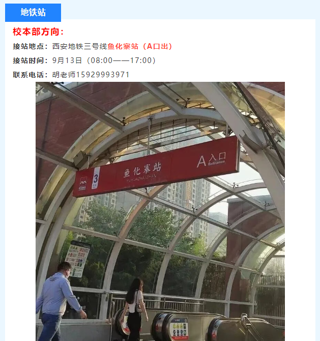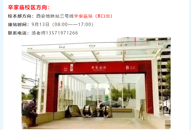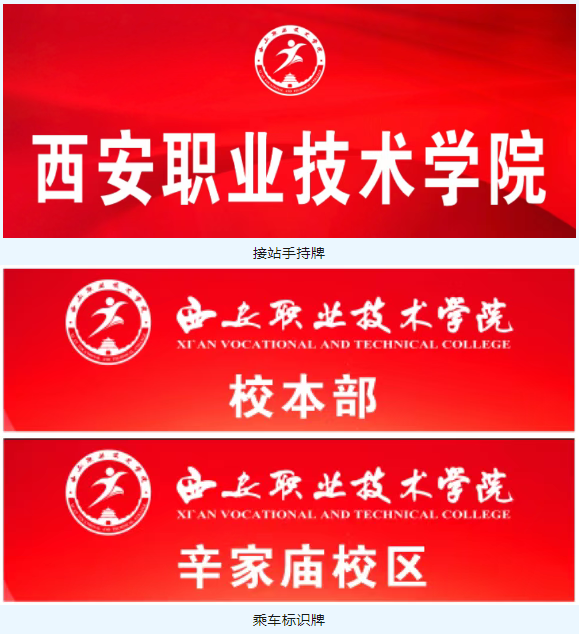 9月13日报到当天,学院分别在西安站(火车站)、西安北站(高铁站)、地铁三号线鱼化寨站/辛家庙站,云巴天谷四路站,设报到接站乘车点。在指定的相应出站口,大家会看到手持“西安职业技术学院”标识牌的接站志愿者和老师,大家可以乘坐学院专车到校,也可自行到校。