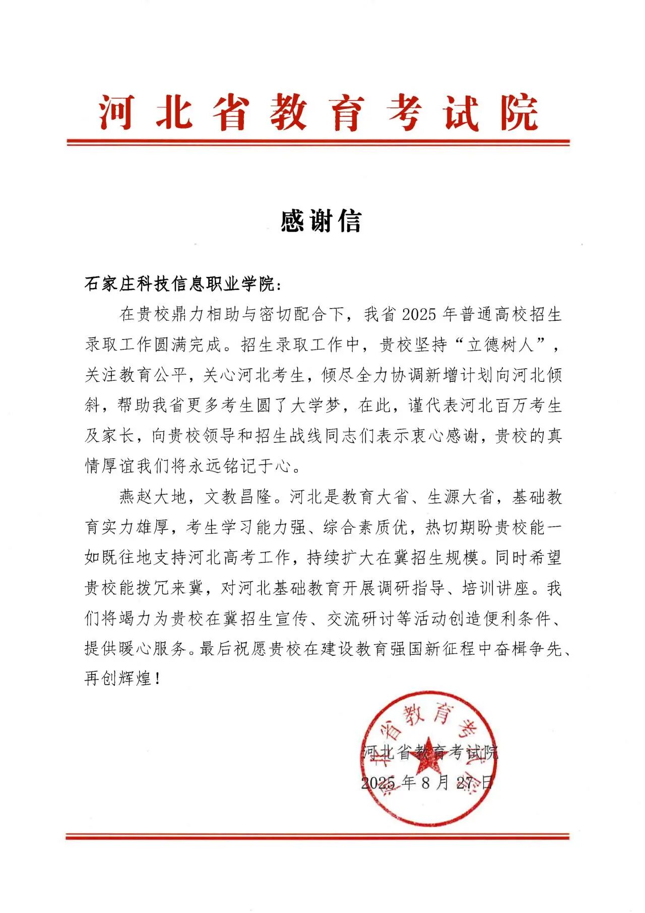 近日,我校收到河北省教育考试院发来的感谢信,信中对我校在2025年普通高校招生录取工作中给予鼎力支持与密切配合表示高度认可和诚挚谢意。