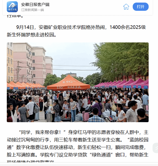 9月14日,安徽矿业职业技术学院格外热闹,1400余名2025级新生怀揣梦想走进校园。