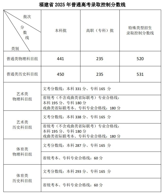 6月24日下午,福建省高等学校招生委员会召开全体会议,研究确定我省2025年普通高考切线方案,部署高招录取工作。经会议研究决定,福建省2025年普通高考各类录取控制分数线具体如下: