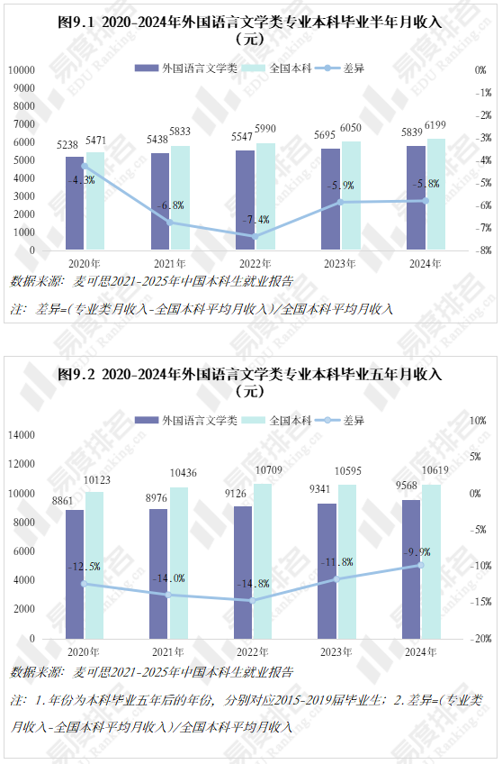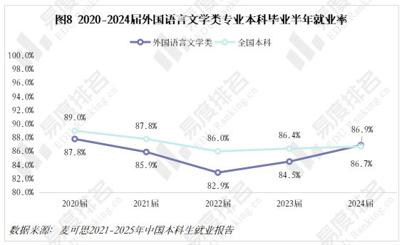 这种薪资增长乏力且差距扩大的趋势,直接反映出该专业类毕业生在职业发展中面临的困境:随着工作年限的增加,单纯语言技能的增值空间有限。部分毕业生甚至不得不转向与专业关联度较低的岗位,进一步拉低了行业的平均薪资水平。