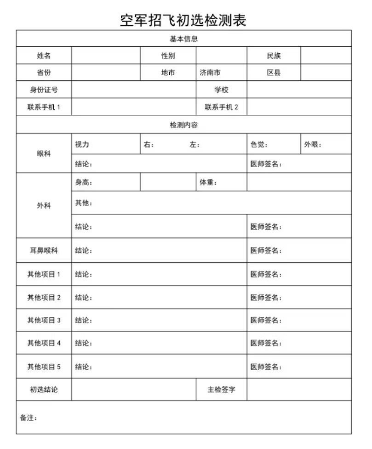 可以吃早餐。为了方便学生参选,初选由空军在各地市设置初选站进行检测,主要包括:外科(身高、体重、坐高、臂长、体形)、眼科(视力、色觉、外眼)、耳鼻喉科(耳、鼻、口腔)等。
