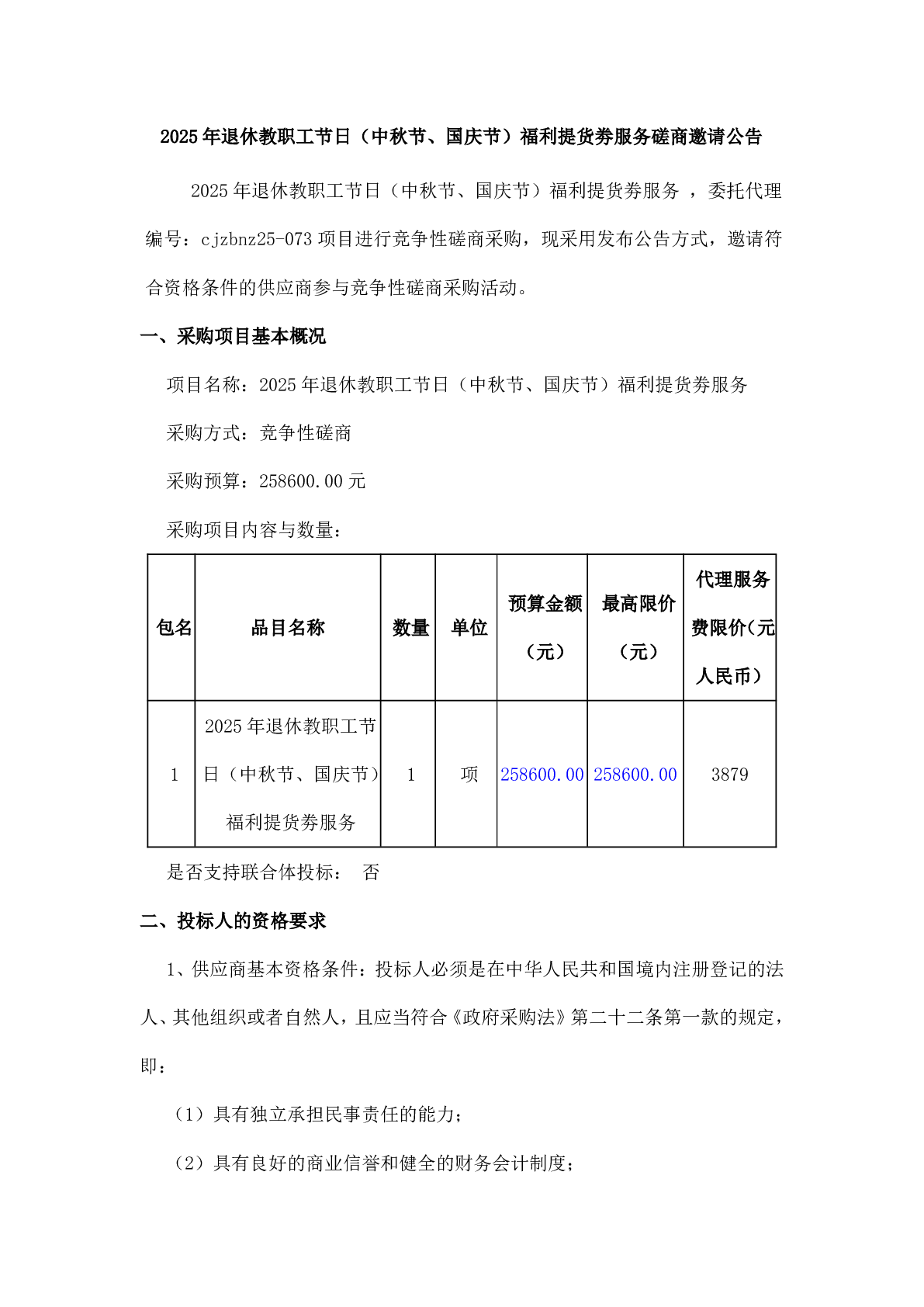 2025 年退休教职工节日(中秋节、国庆节)福利提货劵服务磋商邀请公告