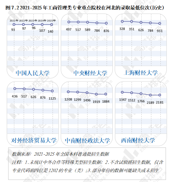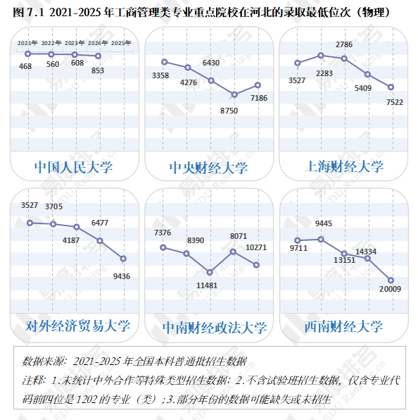 可以明显看出,无论是理科还是文科这些头部院校的录取位次都在逐年下降,部分院校的录取位次甚至翻倍,下降幅度远超高校扩招速度。2025年中国人大在河北甚至不再招收物理科目考生,西南财经大学物理的录取位次更是下降到了超2万位。