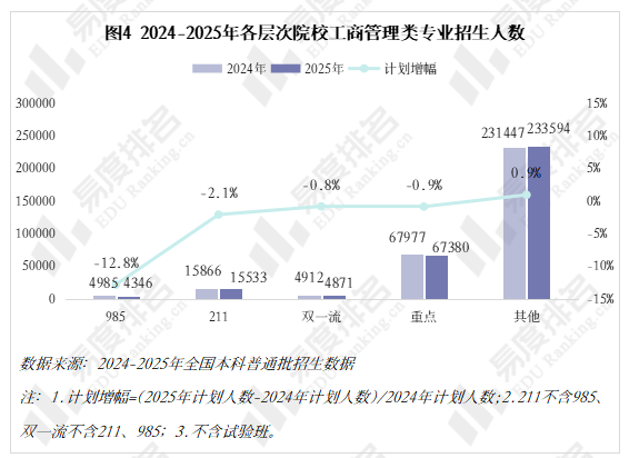 2025年双一流及以上层次院校工商管理类的招生计划共计约2.5万人,仅占所有招生计划的7.6%。海量的招生计划集中在下层院校,这与企业对于管理类人才的需求存在割裂,不仅激化了就业问题,也严重削弱了工商管理类毕业生的整体就业竞争力。