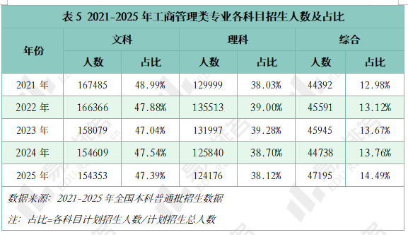 工商管理类专业以文科招生为主,历年文科招生计划占总计划的近一半。文/理科目的招生人数呈下降趋势,2025年综合科目的招生计划有所增加。