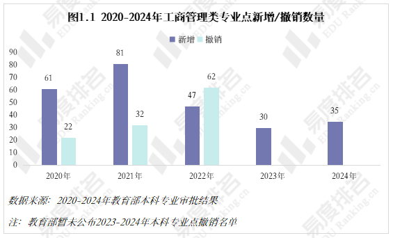 过去五年间,工商管理类的专业点增速逐渐放缓,2022年专业点数量出现负增长,撤销数量首次超过新增,高校正在不断优化工商管理类专业。
