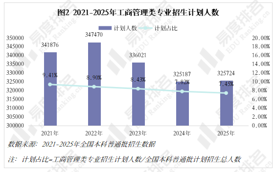 工商管理类专业的招生计划于2023年开始呈下降趋势,这正好与教育部公布的专业审批结果相对应(2022年审批通过专业在2023年开始招生)。