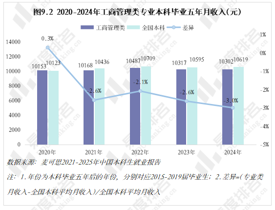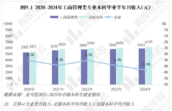 工商管理类毕业半年的薪资待遇持续增长,但与全国本科的平均薪资差异在不断加大,增幅不及其他专业类;而放眼毕业五年的薪资来看,从2023年开始甚至出现了负增长。