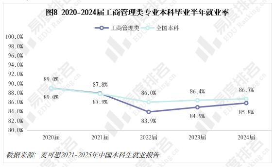 当下整体就业形势仍不容乐观,2024届工商管理类本科毕业生的就业率为85.8%,低于全国本科的平均值。2023届开始就业率有所上升,但仍低于2020届水平。