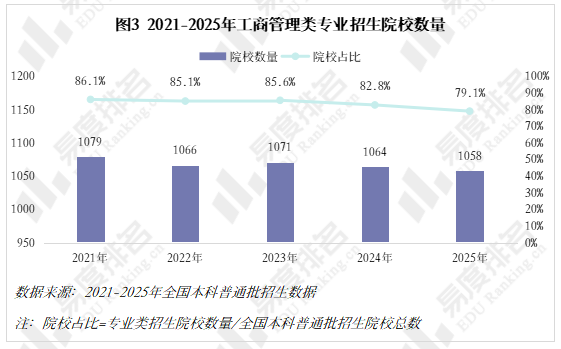 与招生计划相同步,开设工商管理类专业并有招生计划的高校数量有所减少。2021年有86.1%的高校开设有工商管理类专业,如此广的覆盖面必然导致毕业生的严重溢出;该数据于2025年下降至79.1%,覆盖面虽有所降低,但仍旧过高。