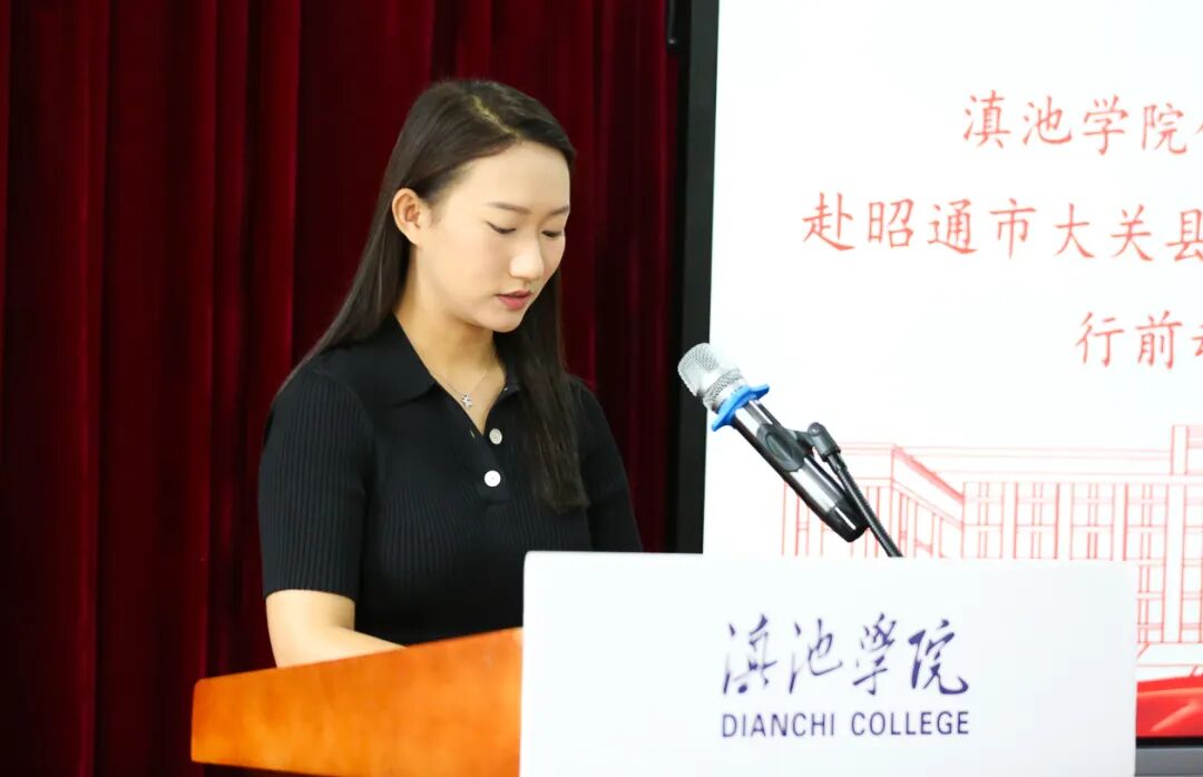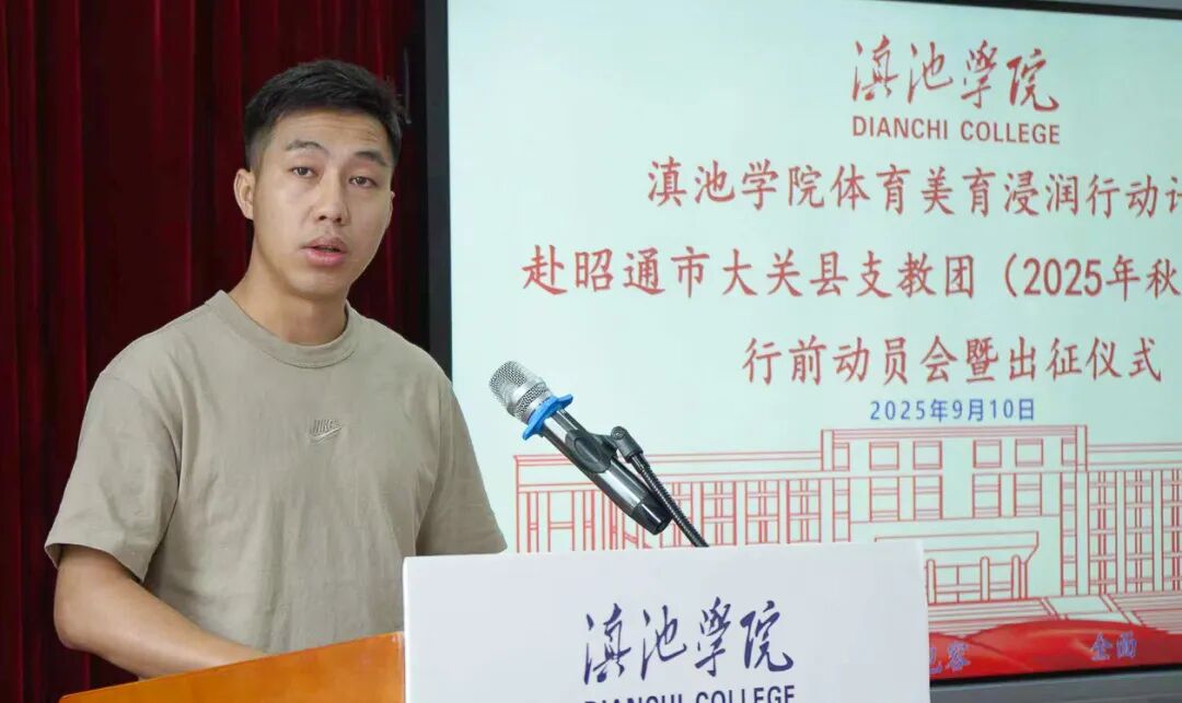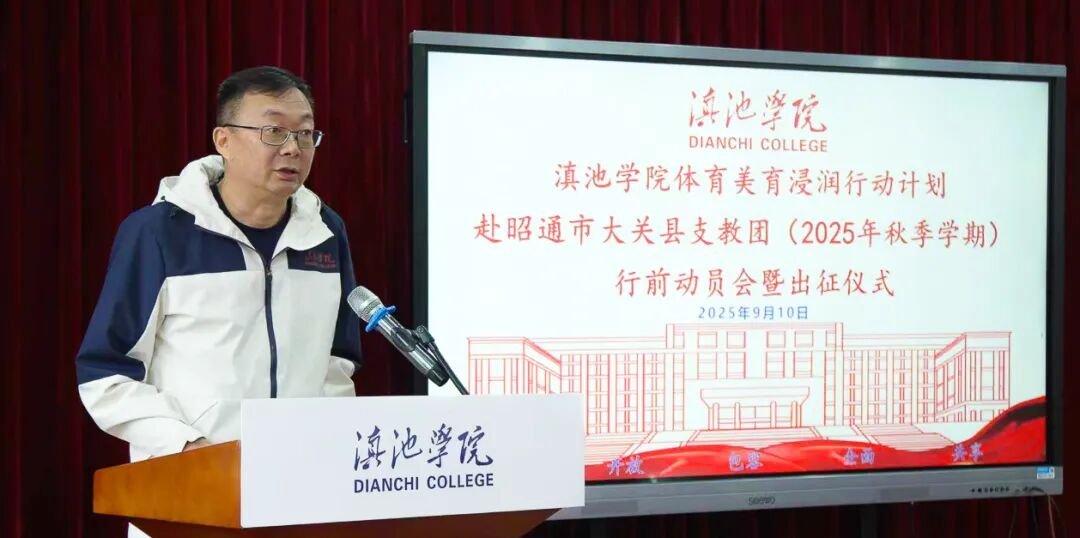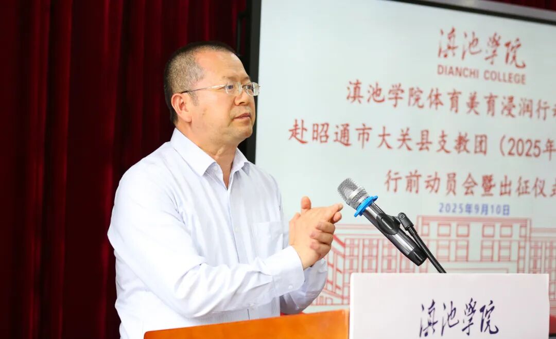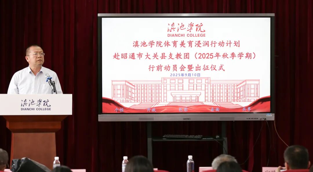 2025年9月10日,滇池学院 2025 年秋季学期体育美育浸润行动计划驻昭通市大关县支教团行前动员会暨出征仪式在知行楼107报告厅举行。滇池学院校长马杰、党委书记陈炳灿、副校长向晓明、高力出席仪式,学生处处长徐东明、体育学院院长秦庆峰、艺术学院院长郭亚非、教务处处长张汝春、校团委书记王怀磊等相关部门负责人、第四期派驻师生代表、第五期派驻师生43名支教团师生参加活动。出征仪式由学生处处长徐东明主持。