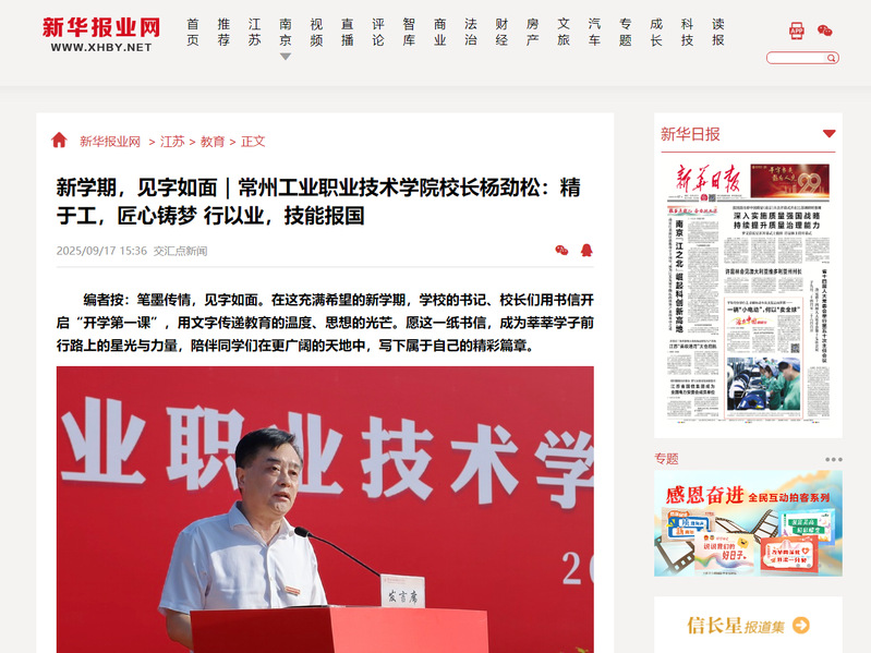 新华报业网:新学期,见字如面|常州工业职业技术学院校长杨劲松:精于工,匠心铸梦 行以业,技能报国