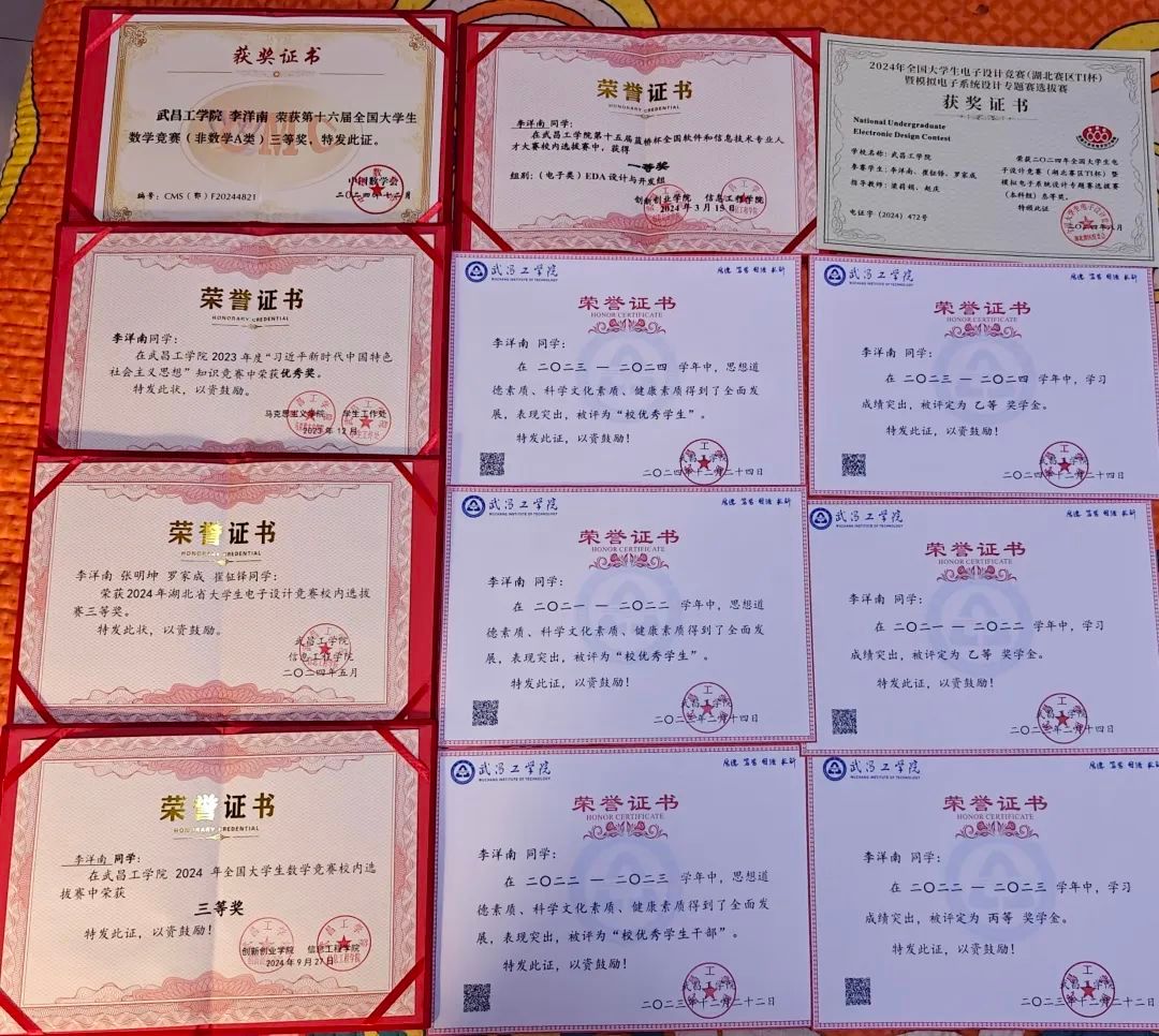 大学四年,李洋南始终践行学校“以赛促学”的教育理念,在各类竞赛中不断磨砺专业技能,锤炼坚毅品格,以优异的表现彰显青春力量。全国大学生电子设计竞赛省赛三等奖、蓝桥杯EDA设计与开发省赛一等奖、第十六届全国大学生数学竞赛国赛三等奖……每一个奖项背后,都是李洋南挑灯夜战调试电路的执着,是无数次推演数学模型的专注。这些竞赛不仅是理论转化为实践的试炼场,更成为他突破自我的阶梯。与此同时,李洋南还在不同领域考取了高含金量的证书,大学英语四六级、全国计算机三级、初级通信工程师等证书,如同拼图般构建起他的专业技能体系,助力他在未来的职业道路上稳步前行。