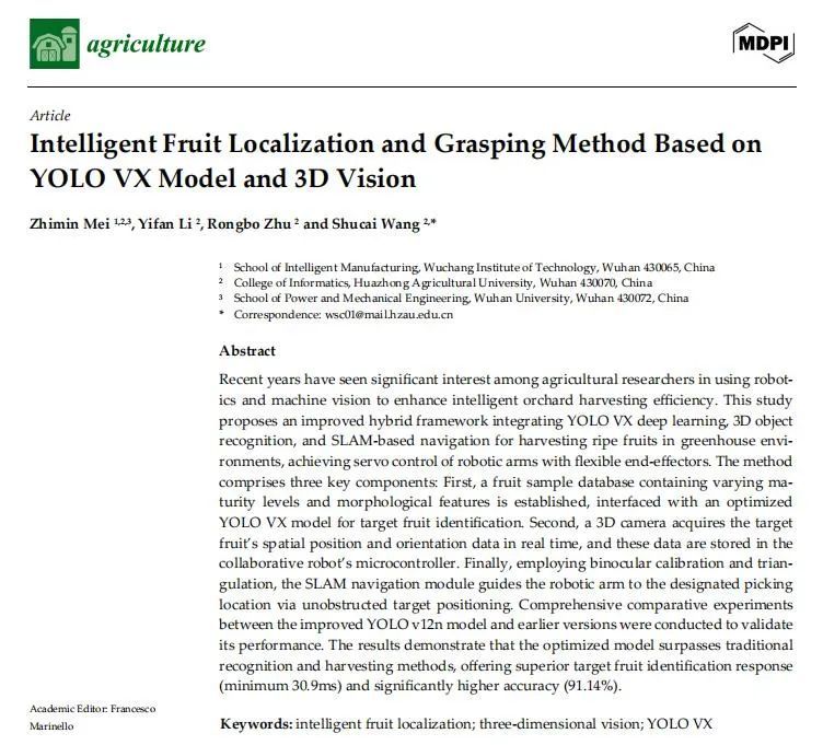 本网讯(通讯员 鲁小雅)近日,我校智能制造学院师生团队在农业科学领域国际学术期刊《Agriculture》(农业)上,发表题为《Intelligent Fruit Localization and Grasping Method Based on YOLO VX Model and 3D Vision》(基于 YOLO VX 模型与三维视觉的智能水果定位与抓取方法)的研究论文。智能制造学院梅志敏副教授为论文第一作者,机器人工程2204班李一凡同学为论文第二作者,武昌工学院为第一完成单位。