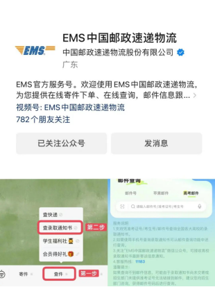 考生可关注“EMS中国邮政速递物流”微信公众号,点击菜单栏“查件”——“查录取通知书”——“查高考邮件”,输入“邮件号/准考证号/考生号”查询。或登陆邮政官网11183上查询。