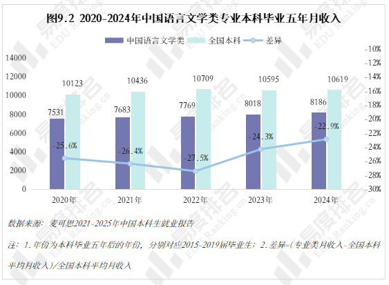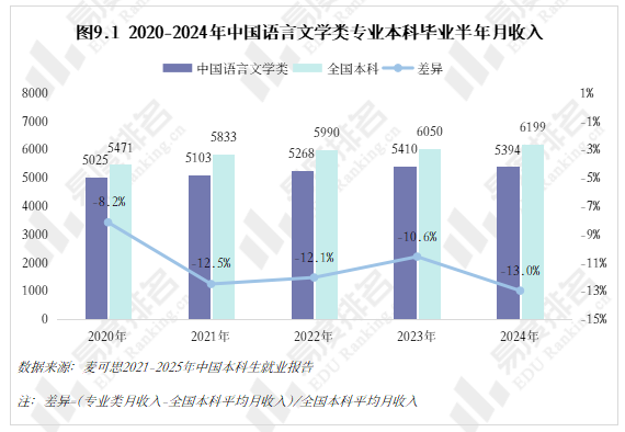 从短期和长期薪酬数据看,中国语言文学类专业毕业生薪资水平不仅起点低,在后期的职业发展中也无法有效缩小与平均水平的差距。毕业五年后,薪资差距进一步扩大至约-23%,绝对差额超过2400元。