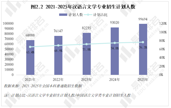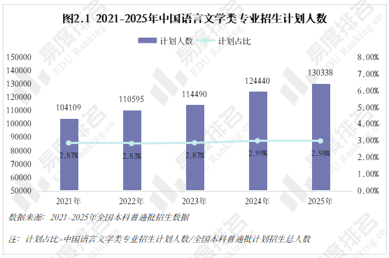 然而在中国语言文学类中,汉语言文学专业的招生主体地位在不断增强。其招生计划从2021年的6.8万多人持续增长至2025年的9.9万人,五年间增幅达46.4%。无论是汉语言文学专业的计划人数还是其占比,都保持了连续三年的稳定增长,各院校对此专业的招生安排趋于稳定和扩张。