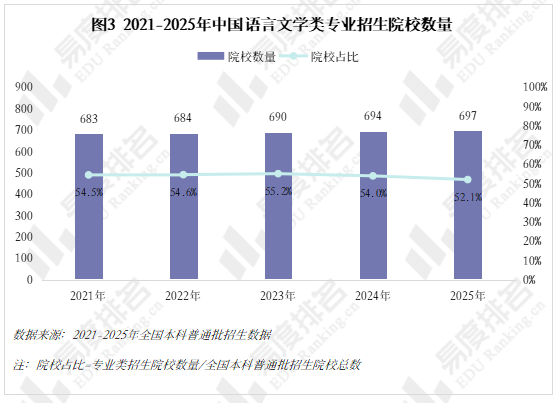 中国语言文学类专业招生院校数量多年始终超过680所,占全国本科院校比例持续高于52%。近三年占全国本科院校的比例连续小幅下降,但总招生计划每年均有所增长,因此该专业类的招生增量主要来源于现有院校的扩招。
