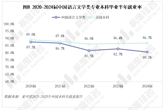 2024届中国语言文学类专业就业状况跌入冰点,就业率低至80.5%。在全国就业整体回暖的背景下,中国语言文学类专业的就业形势却持续恶化。毕业生们在市场中抗风险能力弱、替代性高,无法分享经济回暖的红利,更加凸显专业在就业市场上的“下坡路”。