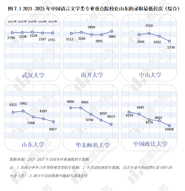 大多头部院校的录取位次都在逐年下降,比如山东大学、华东师大、中国政法三所院校的录取位次以惊人的趋势连续大幅下滑,华东师大竞争力近乎腰斩下,高校录取位次降幅度远超高校扩招速度。然而武大、南开则保持稳定吸引力,南开录取位次逆势上升。
