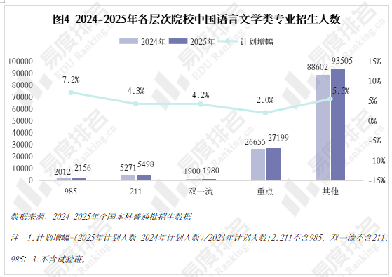 2025年双一流及以上层次院校中国语言文学类的招生计划共计约9000多人,仅占所有招生计划的7.4%。虽然985院校的扩招幅度最高,然而海量的招生计划堆积在下层院校,在传统对口领域存在明显的人才竞争内卷现象。现如今就业越来越取决于学生能否将专业能力与其他技能(如新媒体技术、数据分析、项目管理等)相结合,也倒逼着人才培养向满足分散性、复合型社会需求的新赛道进行分流。