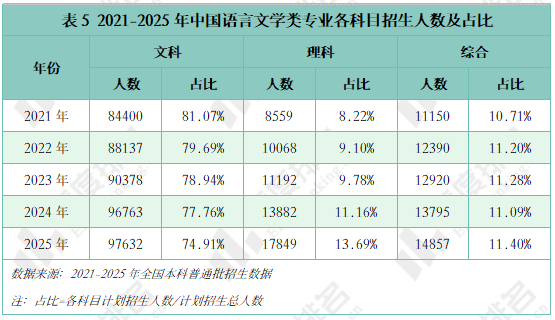 中国语言文学类专业文科生仍是绝对主力,但占比从2021年开始五年下降超6%。理科生招生占比从2021年的8.22% 稳步增长至2025年的13.69%,是变化最显著的群体。为适应数字时代需求,该类专业正从传统的纯文科领域向文理融合的交叉学科方向不断转型。