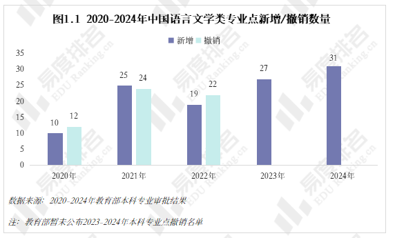近五年中国语言文学类专业新增点数量呈显著上升趋势,尽管每年均有相当数量的院校撤销该专业点,但新增布点的数量从2020年的10个迅猛增长至2024年的31个,开设该专业的整体意愿强劲且仍在增强。