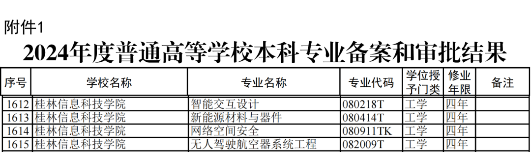 4月22日,教育部正式发布《教育部关于公布2024年度普通高等学校本科专业备案和审批结果及《普通高等学校本科专业目录(2025年)》的通知》(教高函〔2025〕3号)。桂林信息科技学院申报的网络空间安全、新能源材料与器件、无人驾驶航空器系统工程、智能交互设计4个新专业全部通过教育部备案和审批。