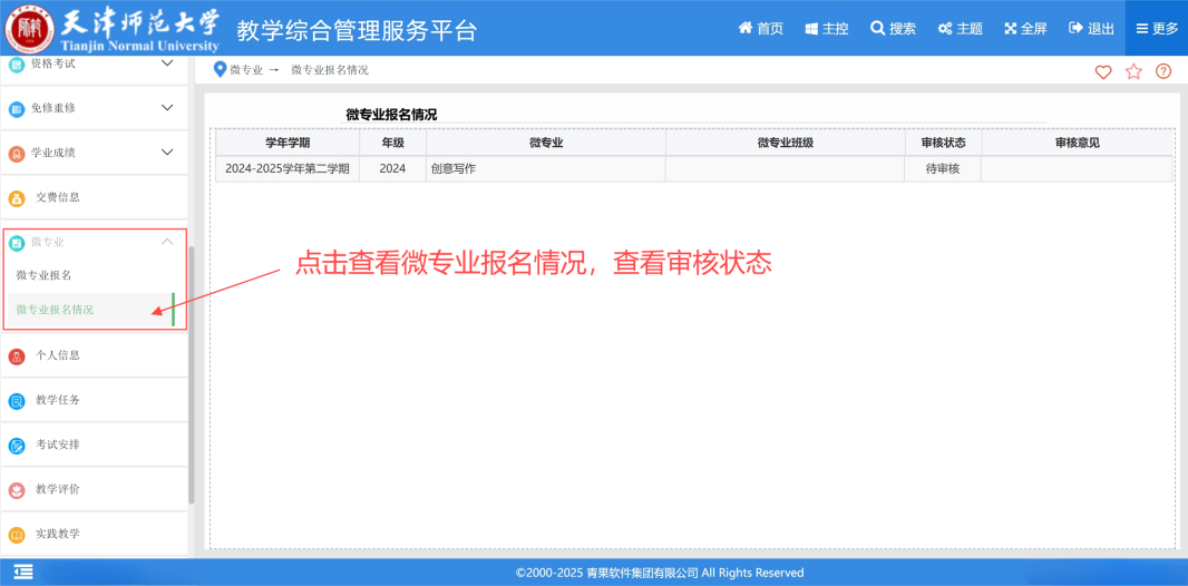 微专业报名成功者,可于教务系统“微专业→微专业报名情况”界面查询,如下图所显示,如未报名成功或微专业学院尚未审批,具体情况可咨询微专业学院。