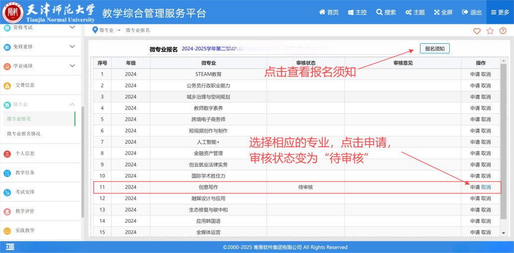 学生报名结束后,微专业所在学院结合各招生简章的选拔方式进行人员选拔,并最晚于9月25日(周四)上午12点前,在教务系统完成微专业审核,学生查看微专业报名结果。