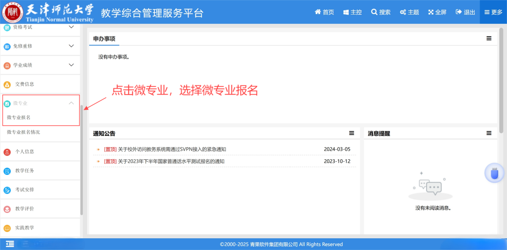 学生报名系统操作流程:主界面→微专业→微专业报名,如下图所示。