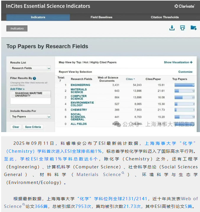 重磅!上海海事大学“化学”学科进入ESI全球前1%