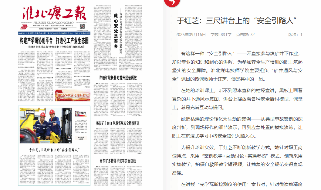有这样一种“安全引路人”——不直接参与煤矿井下作业,却以专业的知识和耐心的讲解,为参加安全生产培训的职工筑起坚实的安全屏障。淮北煤电技师学院主要担负“矿井通风与安全”课目的授课教师于红芝,便是其中的一员。