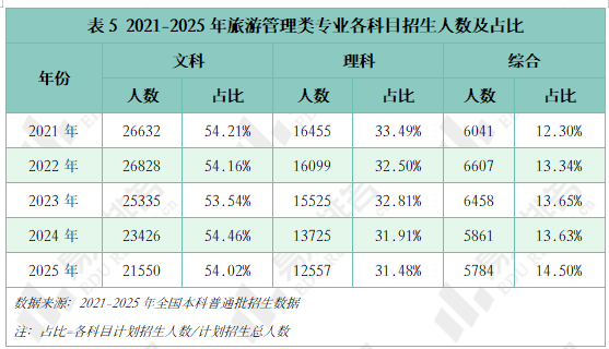 旅游管理类专业以文科主导、理科为辅、综合改革补充的生源结构呈现。文科生作为绝对主力占比始终稳固在54%左右;然而对于理科来说,其招生规模与占比双重下滑,生源的流失说明专业中数理基础整体可能在弱化。这与智慧文旅行业对技术型、分析型人才日益增长的需求背道而驰,未来或许会面临发展动力不足的风险。