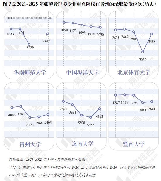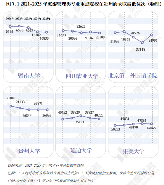 以2025年贵州省旅游管理类专业物理类录取位次最靠前的六所重点院校为例,多数院校录取位次出现了持续小幅下滑,2025年仅北京第二外国语学院去年录取位次异常偏低而有所上调。