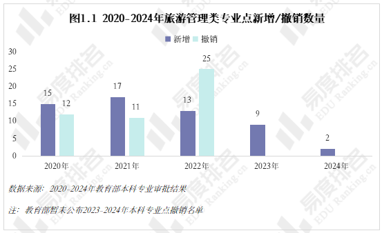 近五年旅游管理类专业点新增数量断崖式下跌,在疫情冲击和行业前景不确定的背景下,各高校对于盲目增设旅游管理专业变得极为谨慎;2022年专业点的撤销数量甚至大幅超过了当年新增点数,一年内就有多达25个专业点被撤销,未来专业点的净增长将极为有限。