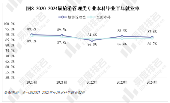 旅游管理类专业就业率虽在2022届因疫情冲击跌至谷底,旅游管理类专业因其行业特性,下滑幅度更为显著,首次且唯一一次低于全国平均水平。近两年随着疫情防控政策调整和旅游业爆发式复苏,行业用工需求急剧增加,带动毕业生就业率实现大幅跃升,不仅收复失地,更反超全国平均水平。