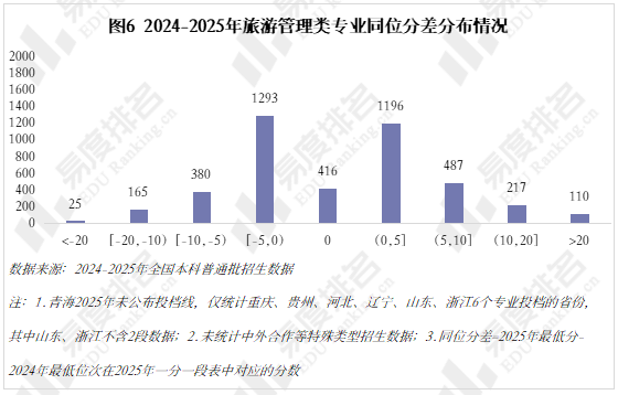 旅游管理类47%的专业分数上涨,43%的专业分数有所下降,其中近13%的专业下降超过5分,19%的专业上涨超过5分,整体涨分群体在规模上略大于降分群体,但仍有相当比例的[-5,0)分数区间出现了明显下降。