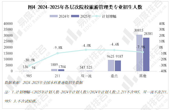 2025年所有层次的院校都缩减了旅游管理类专业的招生计划,无一例外。双一流及以上层次院校旅游管理类的招生计划共计约2300多人,仅占所有招生计划的5.8%,甚至院校层次越高,招生计划的削减幅度越大。