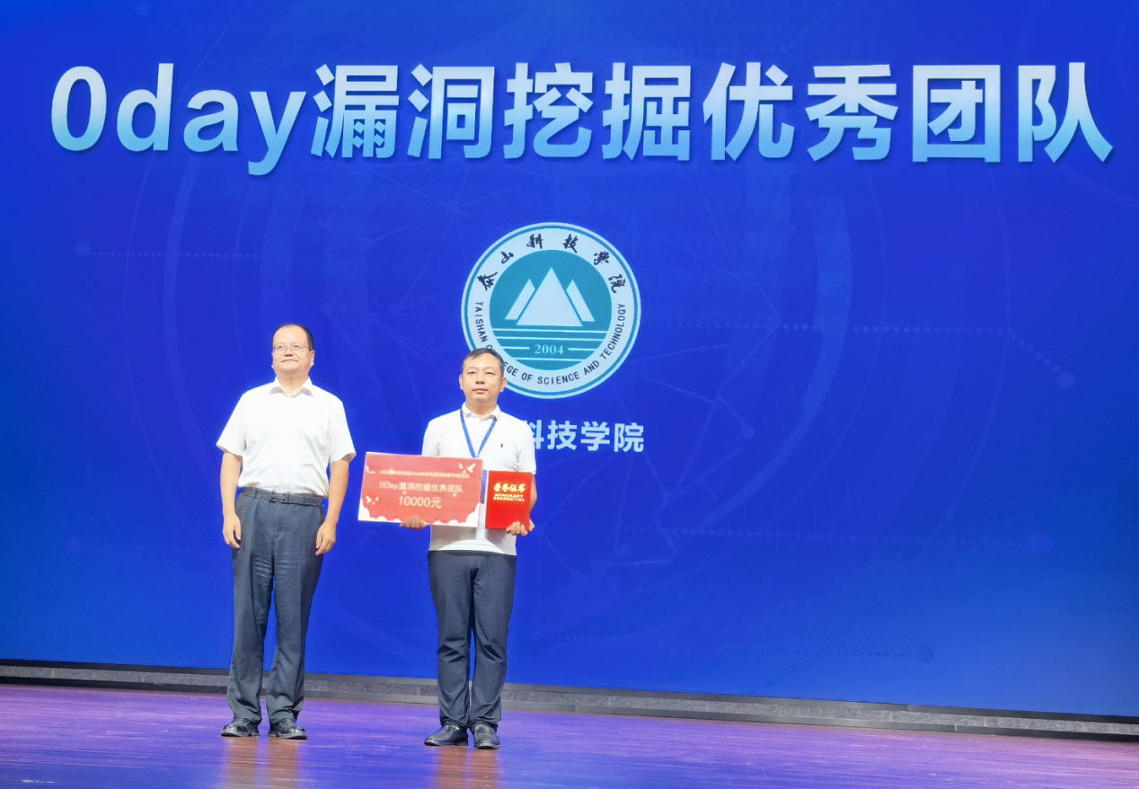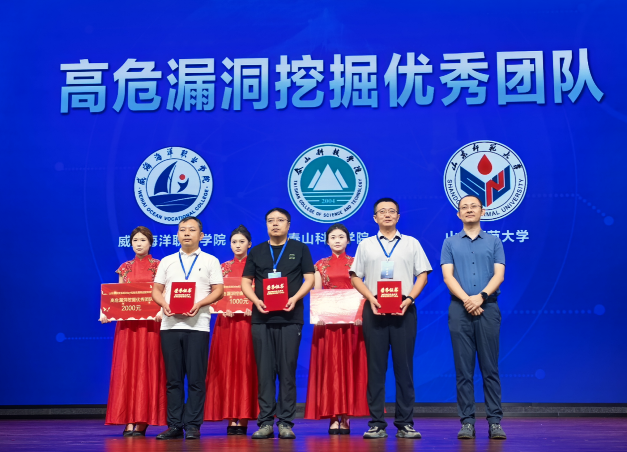 9月16日,在2025年国家网络安全宣传周山东省校园日活动期间,泰山科技学院安全技术团队带领大数据学院学生凭借扎实的专业能力,一举斩获“高危漏洞挖掘优秀团队”一等奖,并成为全省唯一获评“0day漏洞挖掘优秀团队”的高校,分获奖金2000元与10000元。该奖项由山东省委网信办、山东省教育厅联合颁发,充分体现了学校在网络安全技术研发与实践应用方面的领先水平,也标志着其“产学研用”深度融合模式取得重要进展。