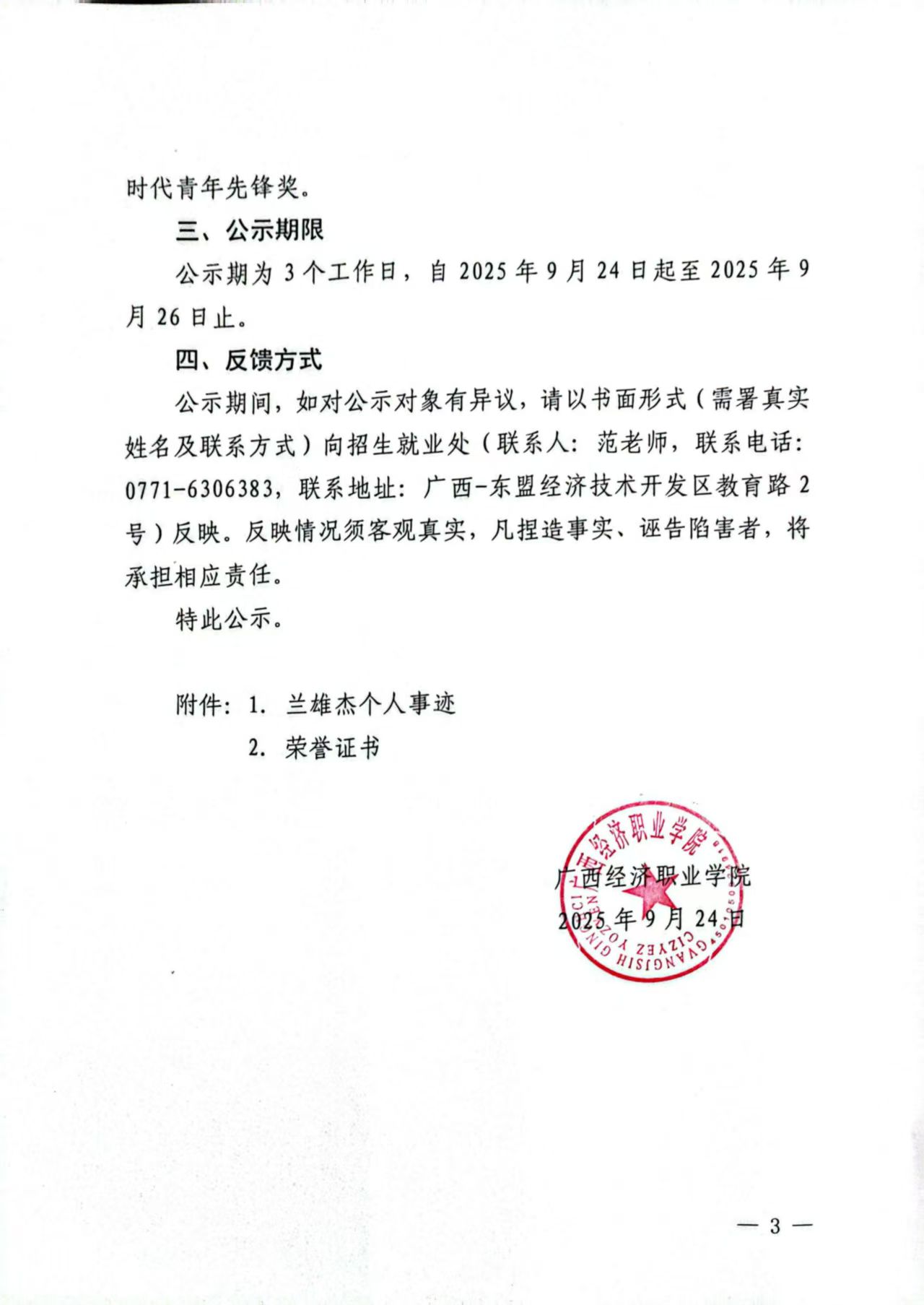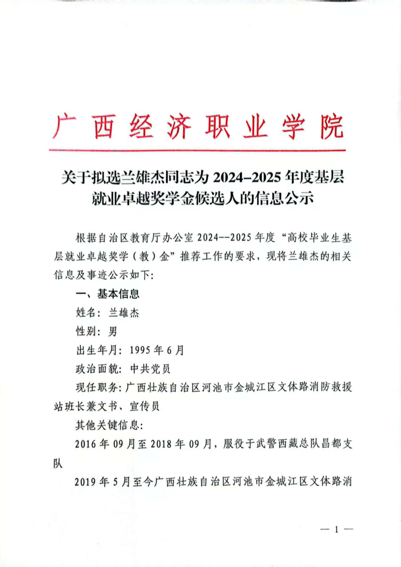 关于拟选兰雄杰同志为2024-2025年度基层就业卓越奖学金候选人的信息公示