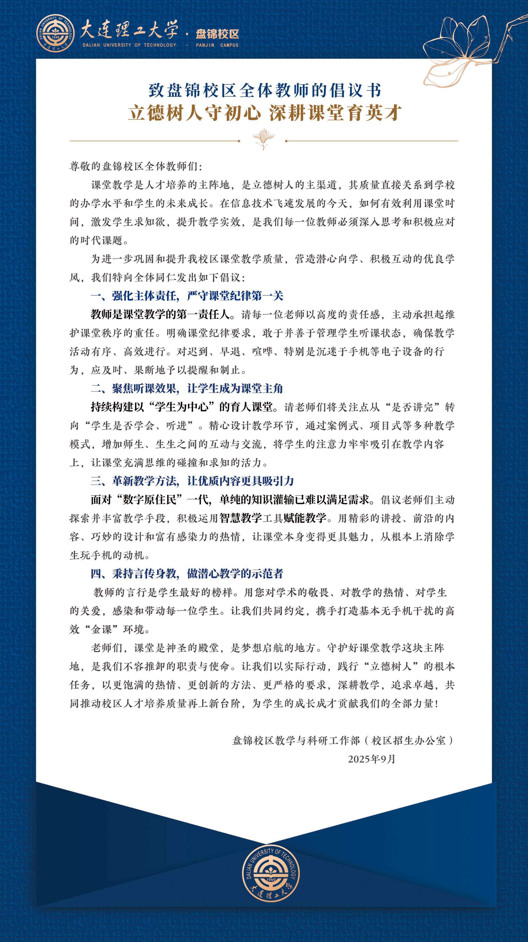 致盘锦校区全体教师的倡议书