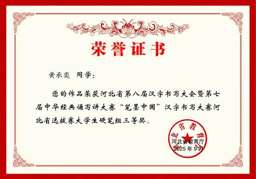日前,从河北省第八届汉字书写大会暨第七届中华经典诵写讲大赛“笔墨中国”汉字书写大赛河北省选拔赛的结果获悉,我校师生表现优异,斩获多项荣誉。余青烨、吴紫璇等2名同学荣获大学生硬笔书写组二等奖;陈思雨(小学教育专业)、黄承奕、陈思雨、王超文等4名同学荣获大学生硬笔书写组三等奖;徐雨婷同学获师范院校学生组粉笔书写二等奖;胡子彤、于欣两位同学分获师范院校学生组粉笔书写优秀奖;王瀚茁、滕梓怡同学在大学生组诵读比赛中分获二、三等奖;周丽娟老师荣获教师组粉笔书写一等奖。此外,余青烨、吴紫璇、徐雨婷等同学以及周丽娟老师的共7份优秀作品,经组委会遴选推荐参加全国总决赛。