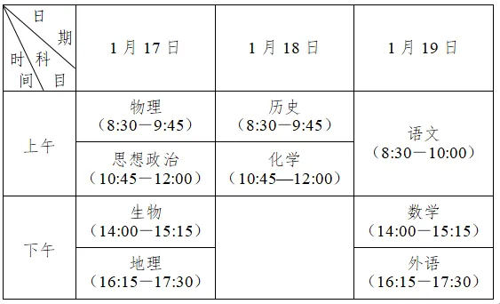 考试时间为2026年1月17日-19日。除语文科目考试时长为90分钟外,其他各科均为75分钟。具体安排如下: