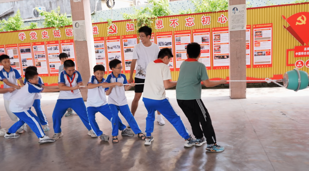 “一直待在教室里上课,孩子们很容易觉得枯燥。”2023级化学师范专业学生林津如说,为了进一步调动孩子们的积极性,队员们把课堂搬到室外,组织了一场 “马德堡半球拔河比赛”,通过游戏来讲解“大气压”的知识。