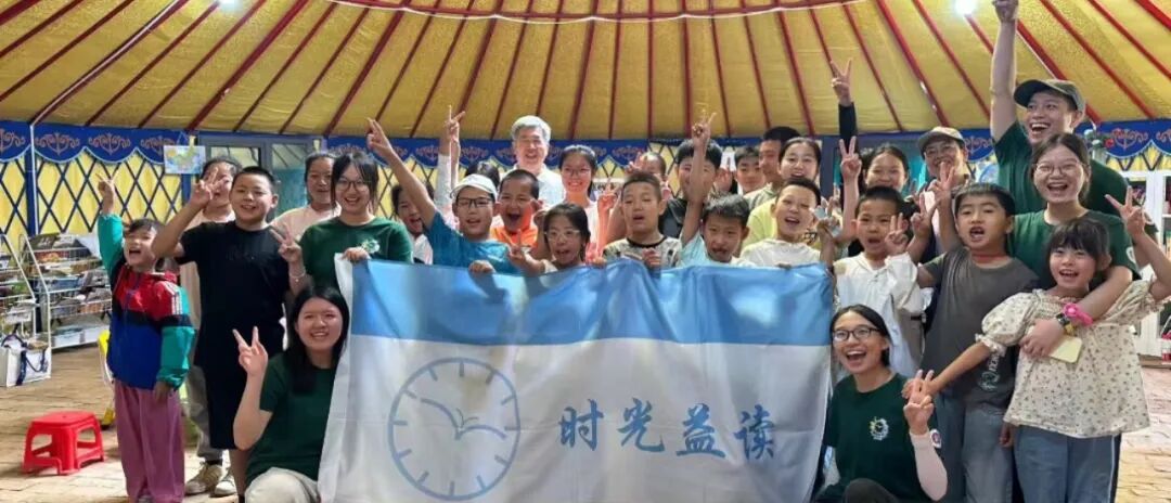在蓝天白云、一望无际的绿草地的映衬下,一顶青蓝色的蒙古包安静地伫立着,四周蜀葵盛开,水塘如镜,远处可见牧羊人与无边的玉米地。这座由深圳大学“时光益读”团队两年前建于包头市土默特右旗双向营村的公益图书馆,如今已成为草原孩子们求知寻新的殿堂。
