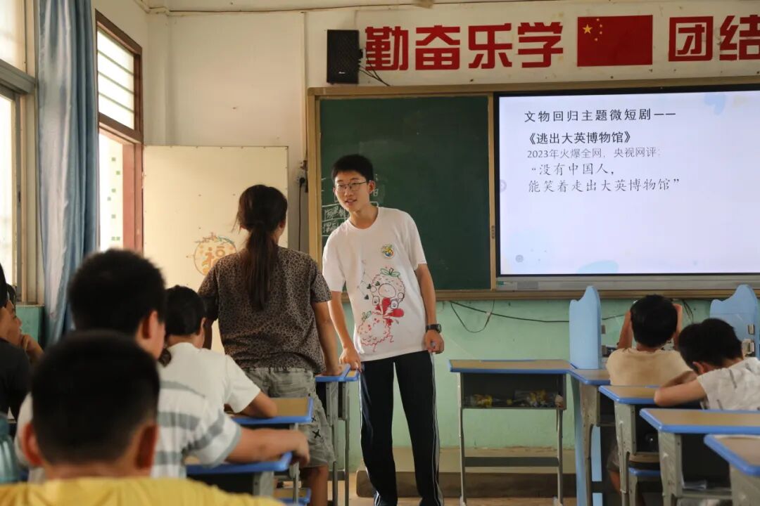 在汕尾市陆丰县甲子镇新青村的小学夏令营课堂上,“流散海外的文明瑰宝”趣味课堂来到了最后一个课时。2024级汉语言文学专业的李若麟为饶有兴致的孩子们播放短剧《逃出大英博物馆》第三集,当结尾那些肃穆而灵动的历史文物异口同声地说出“愿山河无恙,家国永安”时,他和不少孩子们的眼眶都湿润了。