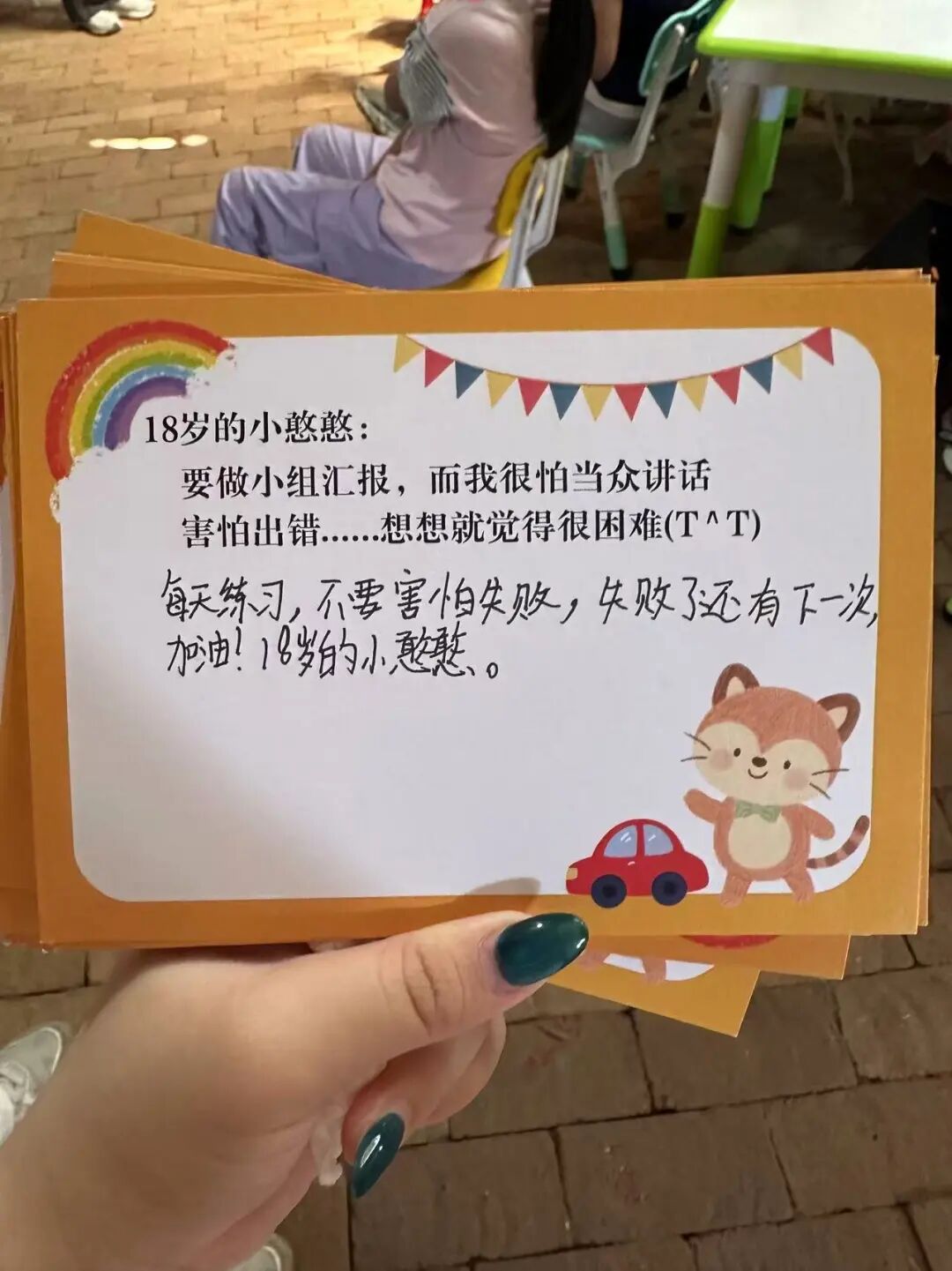 “时光之灵”队伍在支教过程中特意设计了“心晴纸条”,他们收集大人们的烦恼打印到一张卡片上,让孩子们以独特的处事视角看待这些成人世界的烦恼,给他们提出建议,用童真的智慧“四两拨千斤”。